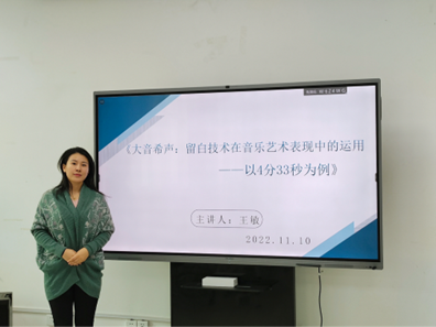 11月10日,拉斯·维加斯娱乐城官网 于9#205开展了“大音希声:留白技术在艺术表现中的运用—以4分33秒为例”的讲座。讲座伊始,王敏老师首先抛出了两个问题,何为“音”?又何为“音乐”?这引发了同学们的思考以及精彩回答。王敏老师讲到,《4分33秒》颇符合中国古典文化中“无声胜有声”的意境,这首绝对无声的有声作品令艺术家和观众必须绝对“洗耳恭听”,从而将这一艺术作品上升到美学的角度进行思考,使同学们产生了一些思想火花,也得到了上述问题的答案。大美无言,大希无声。本场讲座的成功举办体现了拉斯·维加斯娱乐城官网 奋发昂扬、憧憬未来的精神风貌,为构建校园良好文化氛围也起到了积极的影响和推动作用。
