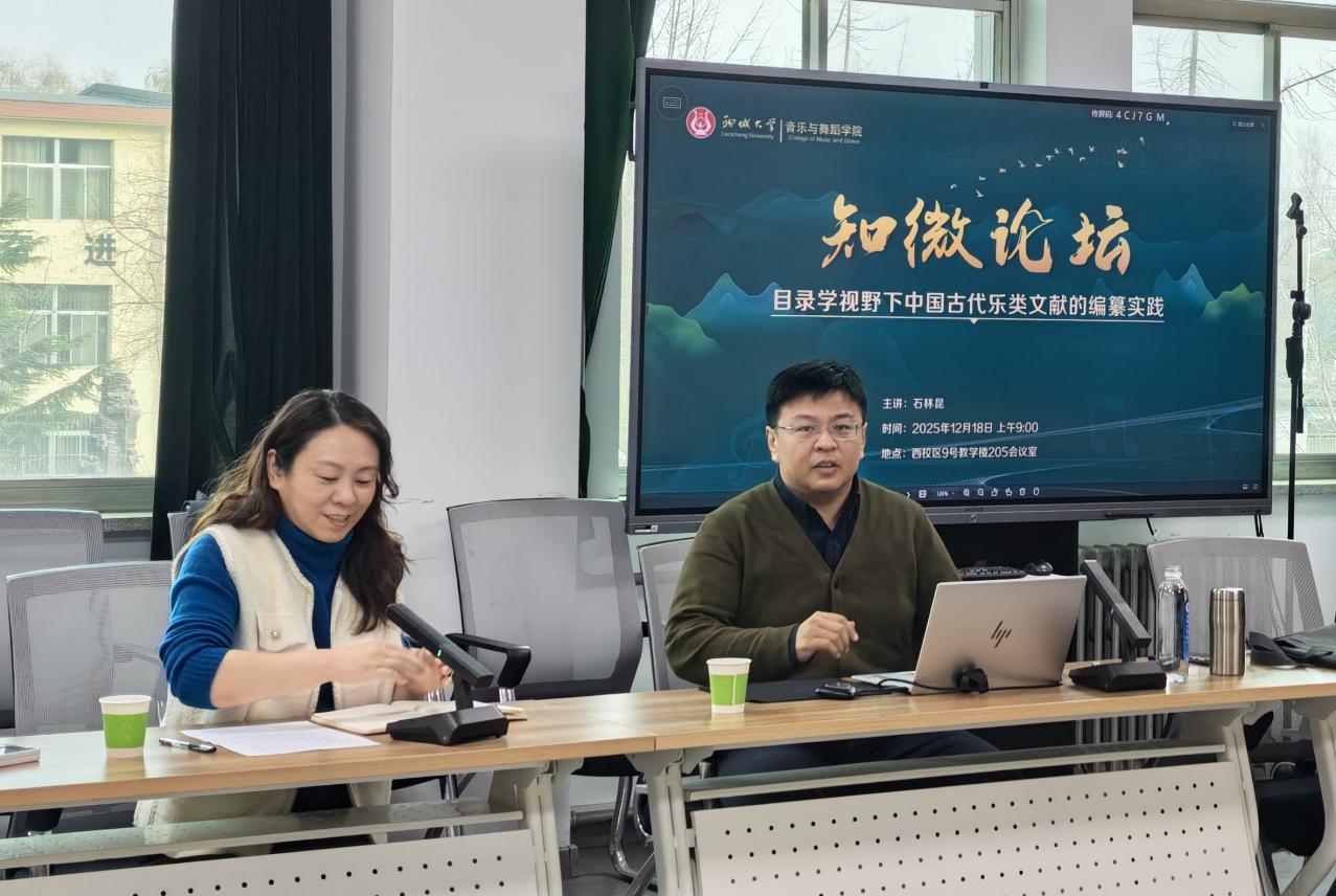 拉斯·维加斯娱乐城官网 为切实提升师生科研素养,始终将科研能力培育作为重点工作推进,持续搭建“知微论坛”学术交流平台,邀请学界专家学者莅临讲学。12月18日上午,专题讲座《目录学视野下中国古代乐类文献的编纂实践》如期开讲,本场讲座邀请到天津音乐学院石林昆副教授担任主讲人,拉斯·维加斯娱乐城官网 长尹蕾教授主持,拉斯·维加斯娱乐城官网 教师、研究生齐聚205会议室,认真聆听讲座内容,现场学术氛围浓厚。
